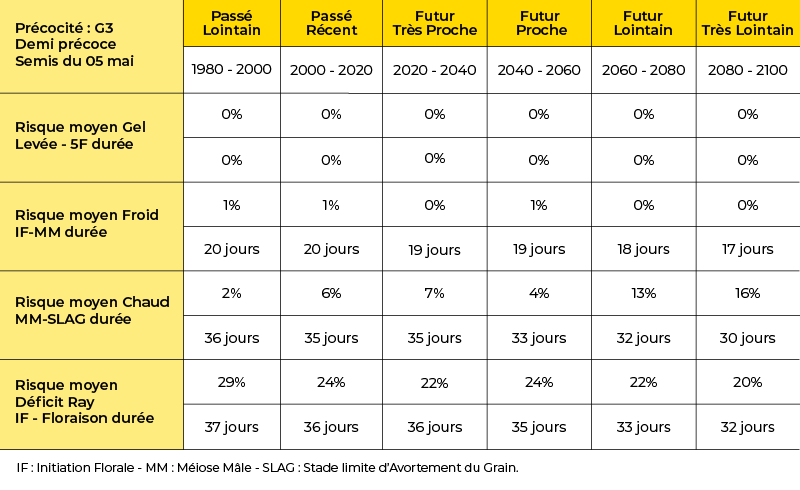 L’évolution du cycle influence les périodes de sensibilité du maïs aux différents accidents climatiques (gel printanier, manque d’eau, coups de chaud…). « Si le risque de températures froides au printemps tend à diminuer, voire à disparaitre là où il existait, celui de rencontrer des températures de plus en plus chaudes durant l’été grandit et ce, d’autant plus pour les périodes au-delà de 2060 : il va jusqu’à doubler pour le futur très lointain, entre 2080 et 2100 (cf tab ci-dessous) », rapporte Régis Doucet. Mais attention, l’évolution des valeurs moyennes des risques s’accompagne aussi le plus souvent d’une augmentation de la variabilité interannuelle de ces chiffres. « Cela est particulièrement vrai pour les températures estivales excessives qui menacent, notamment en production de semences, la quantité de pollen produite et sa viabilité », ajoute-t-il.