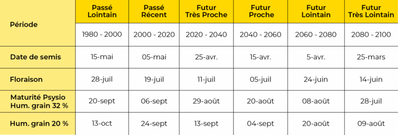 Quel que soit le modèle utilisé, l’un des premiers constat est que le cycle de développement des plantes devrait s’accélérer. « Cela se traduit, à date de semis constante, par une avance de la date de floraison de l’ordre de 2 à 4 jours pour le futur proche (période 2040-2060) et de 9 à 12 jours pour le futur lointain (période 2060-2080), précise-t-il. La maturité physiologique s’annonce, elle aussi, plus précoce : de 3 à 20 jours selon la date simulée. Autre élément impacté : la durée de la dessication du grain qui passerait de 18 jours actuellement à 12 jours dans les projections futures. »