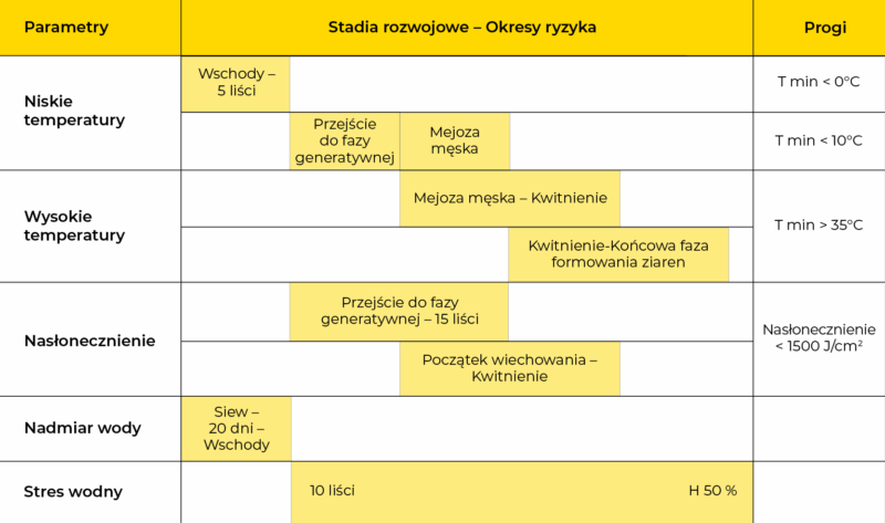Die Beobachtungen der vergangenen vier Jahrzehnte haben zum Beispiel gezeigt, dass die Gefahr von Frühjahrsfrost in der Phase vom Feldaufgang bis zum 5-Blatt-Stadium zu Pflanzenverlusten oder zu einer erheblichen Vegetationsverzögerung führen kann. Ebenso kann es während des Blütenübergangs bei Temperaturen unter 10°C zu Verzweigungsfehlern, Blütenblockaden oder frühen Rispenabbrüchen kommen. Umgekehrt führen übermäßige Temperaturen (über 35°C) zu Wachstumsstörungen zwischen den Stadien der männlichen Meiose und der Blüte, mit möglichen Verlusten der Lebensfähigkeit der Pollen bei späteren Stadien.